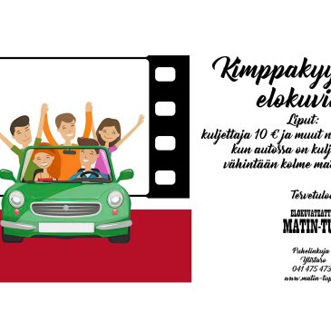 Porukalla elokuviin! Kun autossa on kuljettaja ja vähintään kolme matkustajaa, kuljettaja pääsee elokuviin edullisemmin (10 €). Kyytiläisille normaali lipunhinta. Kampanja on voimassa kaikissa näytöksissämme.